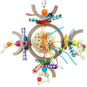 Your bird won't know where to start! This toy is quite large with thick shreddable paper ring and half-moons. Large Wicker ball centre that is stuffed with colourful shredded paper. Finger traps, beads, wood slices and sisal rope tassels.