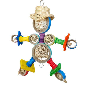 This cowboy-inspired bird toy is packed with exciting textures, including crunchy vine balls, bagel rings, sola, wooden spools, and slices. With his straw hat and playful design, this little cowboy is ready to keep beaks busy and talons tapping.