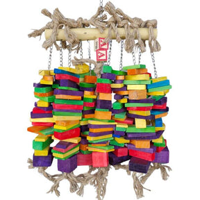 This massive toy offers an irresistibly fun waterfall of ten chain strands, each with colourful blocks. Each chain strand is topped and bottomed with a twist of jute rope, adding an extra layer of playfulness. Crafted from medium-hardness Pinewood and dyed with all-natural vegetable colouring for safe chewing.