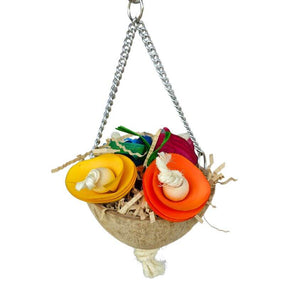 A natural coconut shell filled with fun! This hanging toy features soft balsa wood flowers, shredded paper for foraging, and a sturdy chain for easy hanging. Perfect for birds who love to shred, chew, and explore.