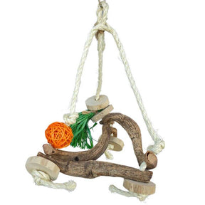 Swing and nibble, your bird can have the best of both worlds! Made with twisted wood perches, java wood slices, loofa and corn husk. Hanging on a sisal rope.