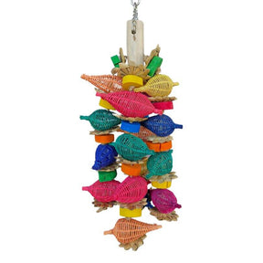 Lashings of coloured wicker lanterns with palm stars hanging on a chain. A vibrant chew-and-play toy.