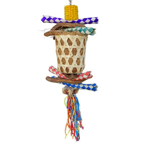 A bamboo basket filled with coconut fibres, sandwiched between mahogany shells, along with woven tubes and a colourful shredder paper tassel, makes this toy perfect for chewing, shredding, and exploring. Great for small to medium birds who love to stay busy!