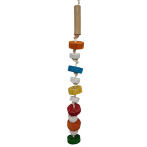 Simple hanging pumice and colourful wood blocks on a sisal rope.
