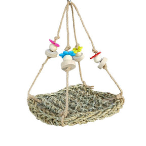 Perfect for Budgies and Cockatiels. Natural seagrass mat hanging on a jute rope with small wood blocks and plastic flower beads. Simple yet fun and not overwhelming for timid birds.