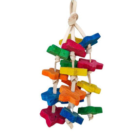 Brightly coloured wood starts hanging on leather ropes. Perfect for small birds that love to play and chew.